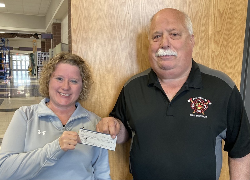 Pecatonica Fire Department Chief, Steve VanVleck presents Andrea McGrew, School Nurse of Pecatonica Schools with a monetary donation to be used to purchase new CPR manikins, AED training devices, and other items related to staff CPR and AED training. The School District is very thankful for this generous donation and looks forward to collaborating with the Fire Department in future endeavors.