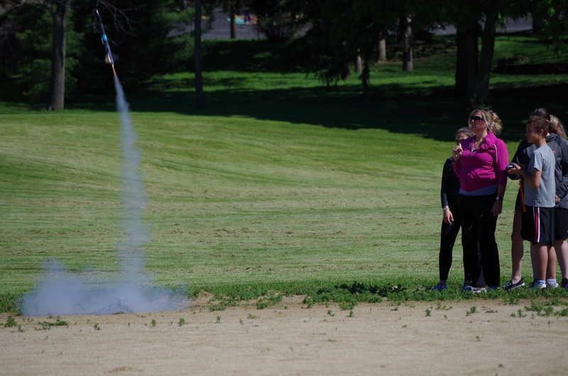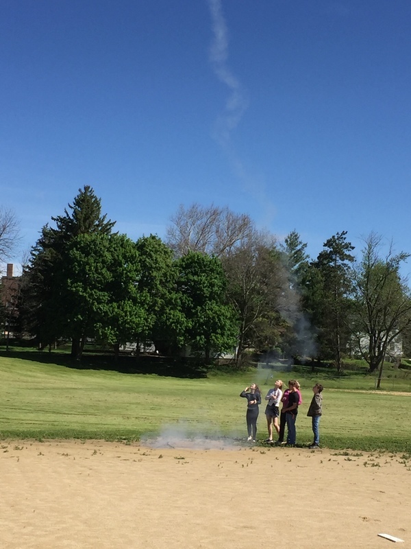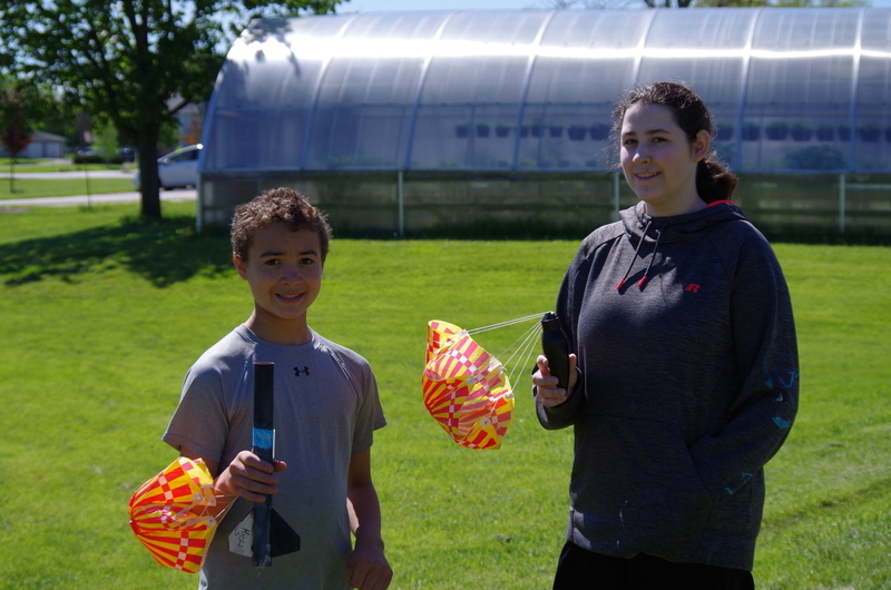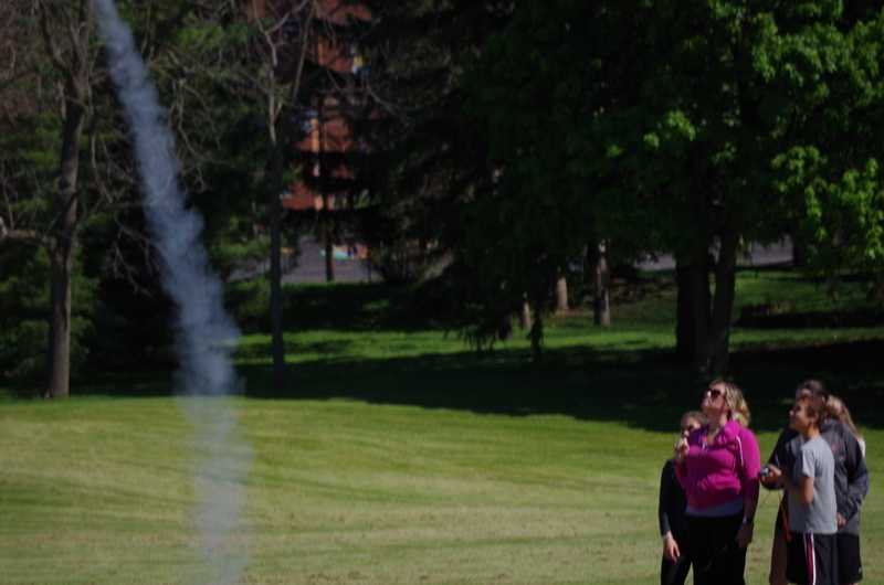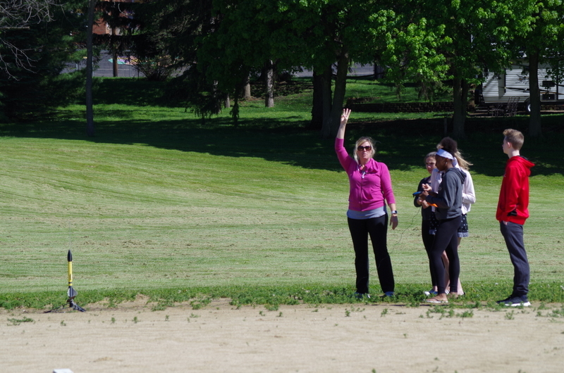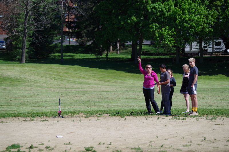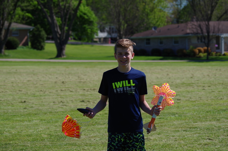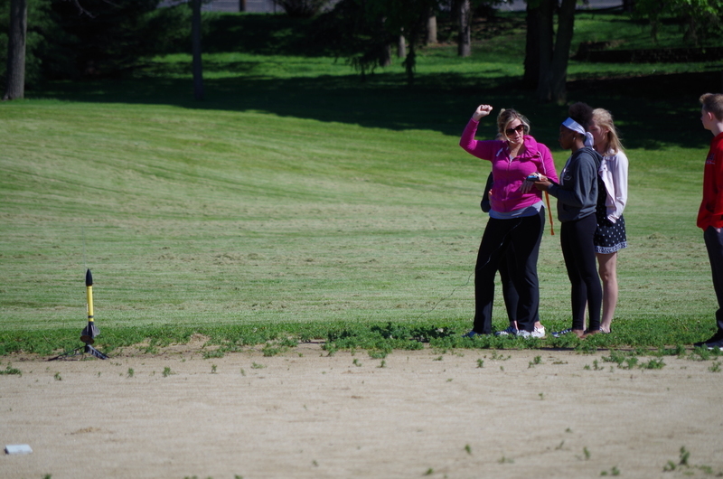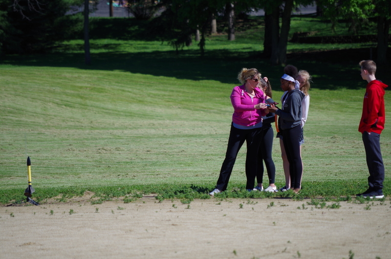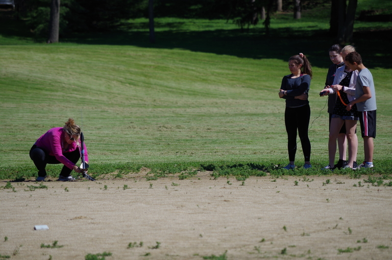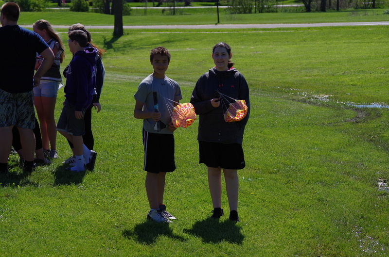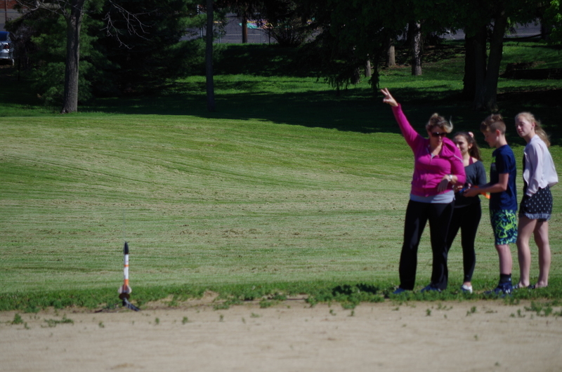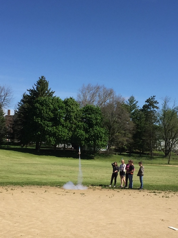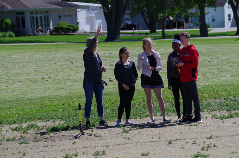 4, 3, 2, 1..BLASTOFF! Rocket launching time at the middle school. Mrs. Dunham’s and Mrs. Lenox’s science students assembled rocket kits and launched during science classes throughout the week of May 20-23, 2019. The rockets lifted high into the sky soaring through the atmosphere and floated and fell to the ground. One team’s rocket couldn’t lift off on the first attempt as the motor mechanism was loose. This was fixed and back to the launch pad it went...The rocket took off reaching great heights. As it fell back to earth, the body tube parachute deployed and it floated gently back to earth. The attached nose cone, which detaches and floats separately, somehow ended up with a twisted parachute and the fell quickly back to earth scrambling the egg that was inside. The egg could be heard sloshing inside of it. The student team was able to explain why it would have been unsafe to launch the rockets without fixing the motor mount and were also able to explain what happened to the nose cone parachute and why it didn’t open. Many onlookers were present including the gym class that had just run the mile. Great job 8th grade teachers, Science classes, and special shout out to Alan Olson for rescuing a rocket part from a tree.