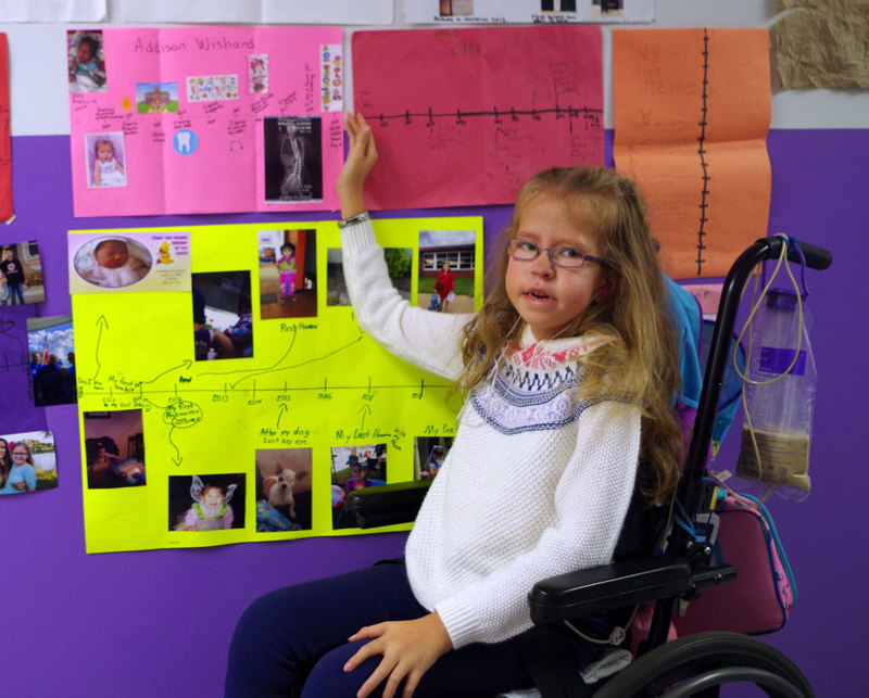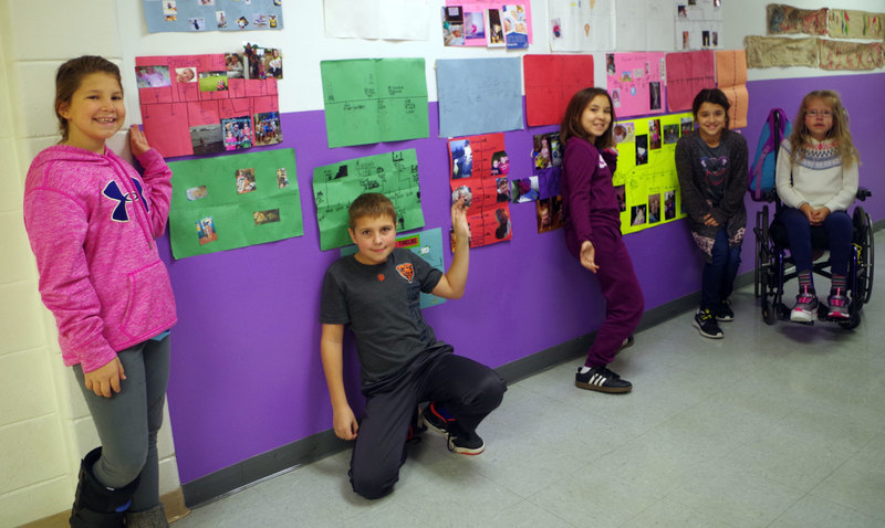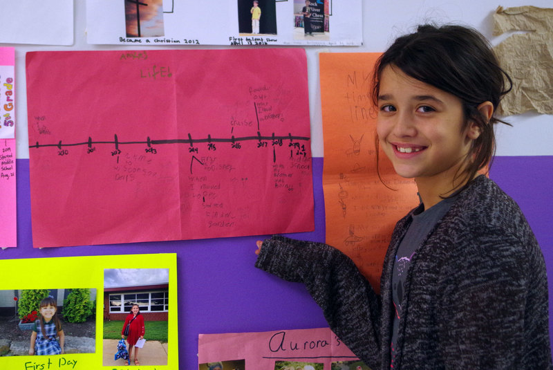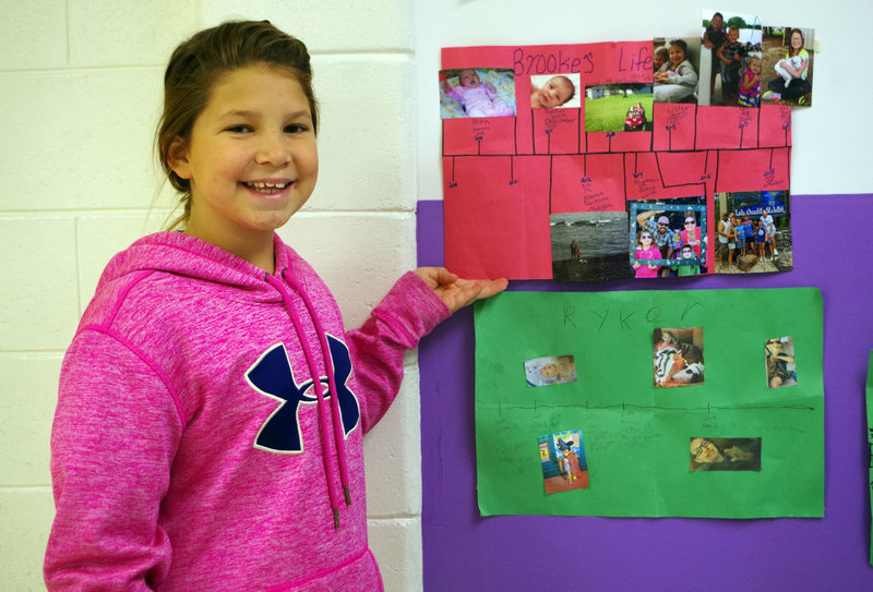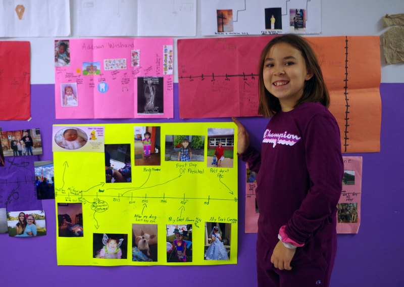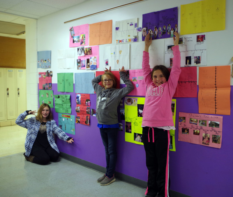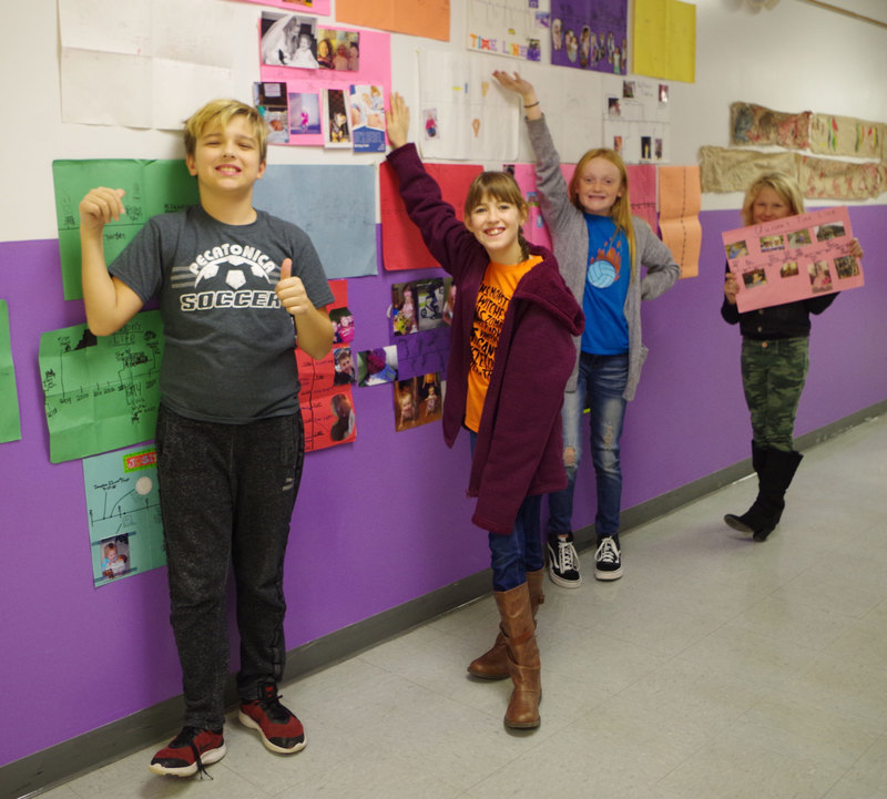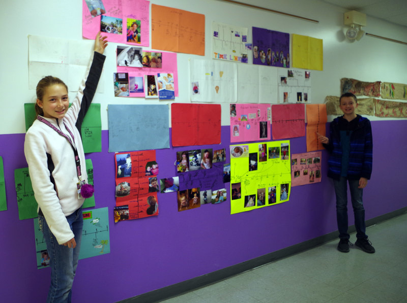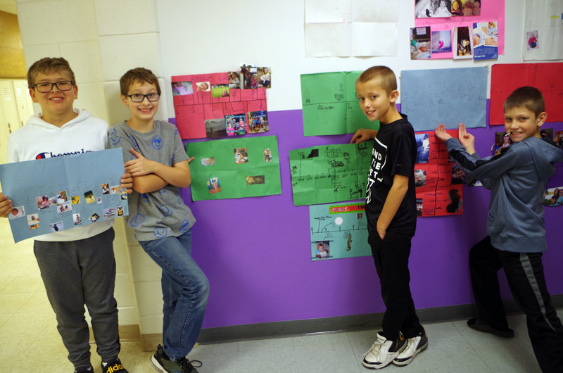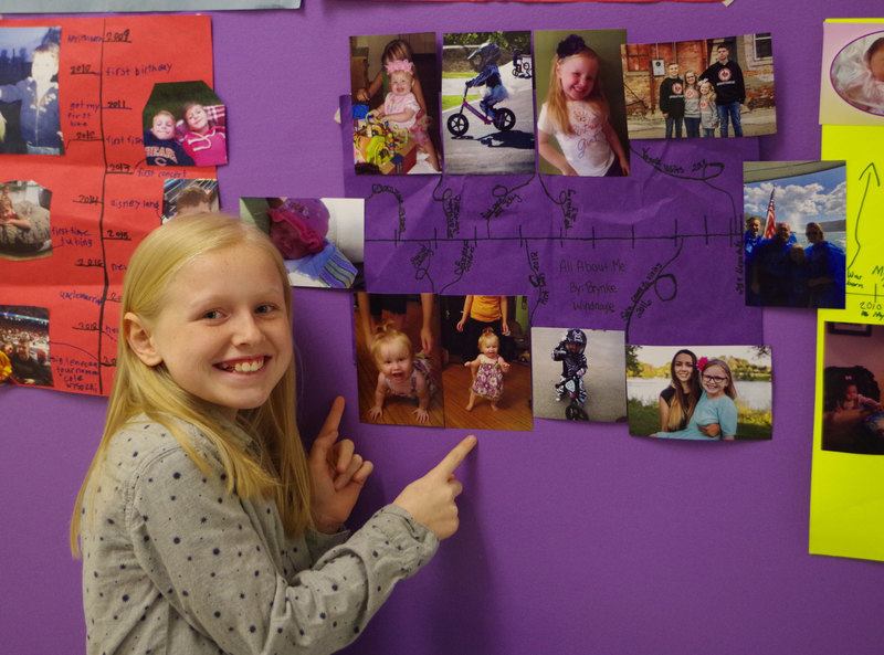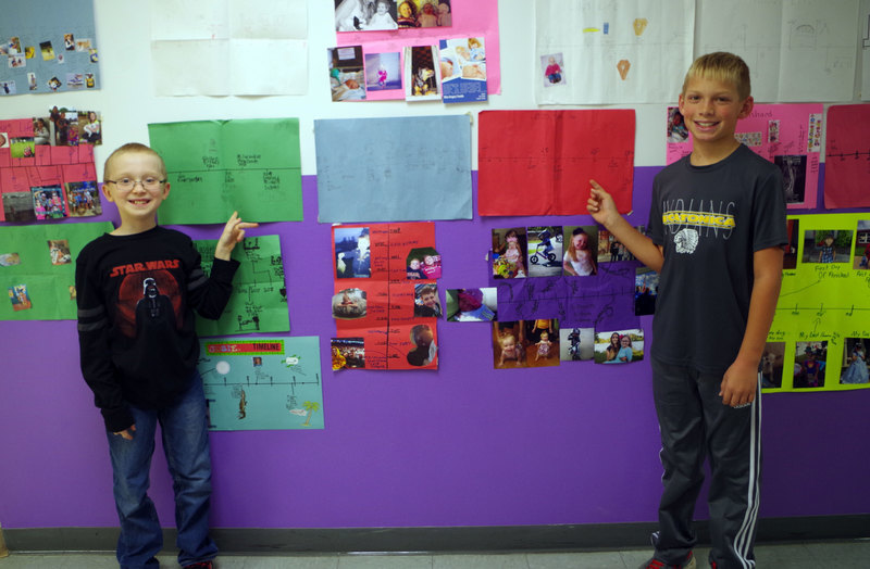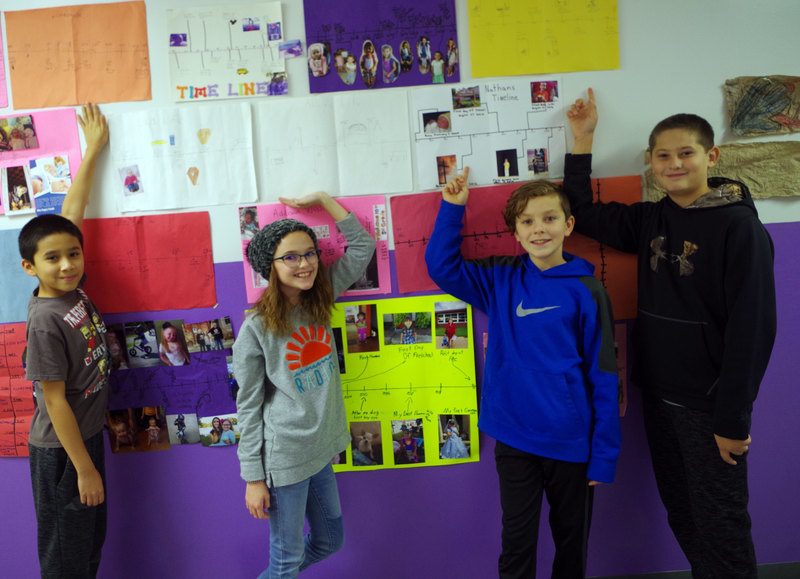 In 5th grade social studies students are learning about timelines and created timelines of very important people, themselves! There was a variety of colorful posters filled with photos and significant life events. These timelines were posted in the 5th grade hall and students are seen pointing to the timeline of their life. Great job everyone!
