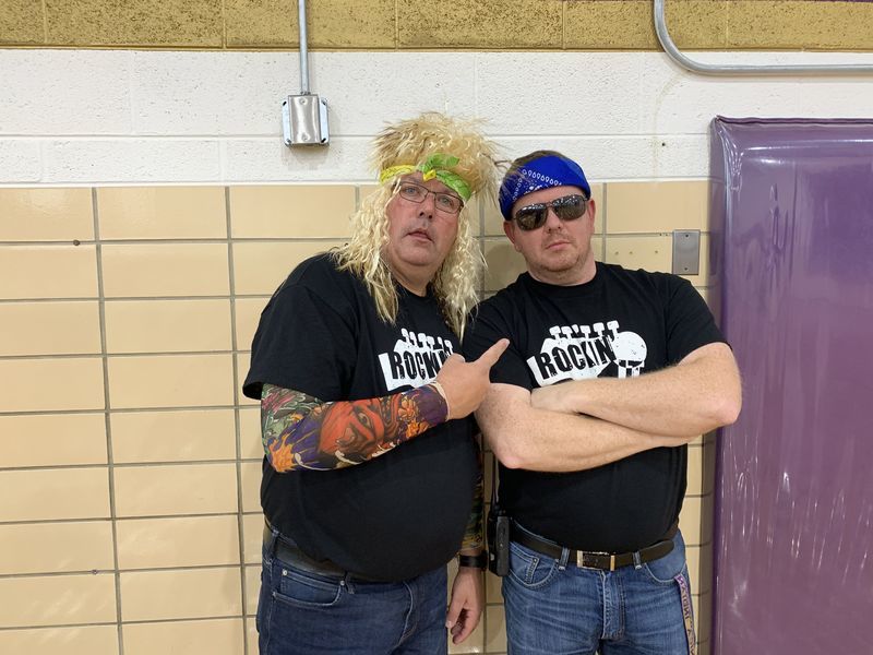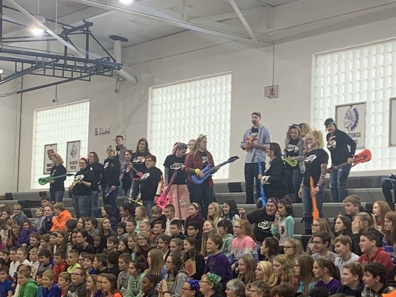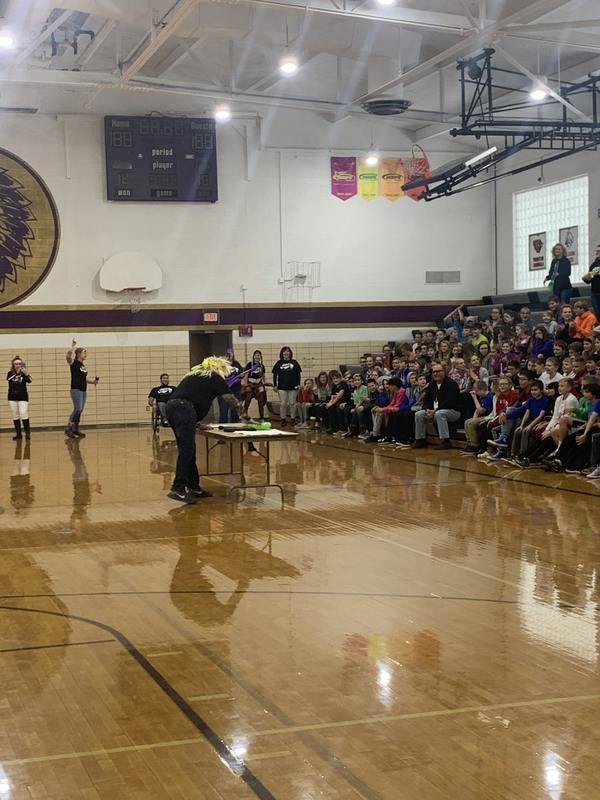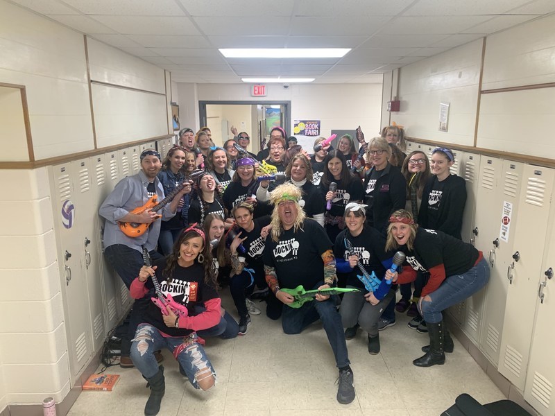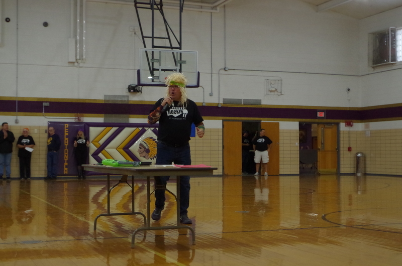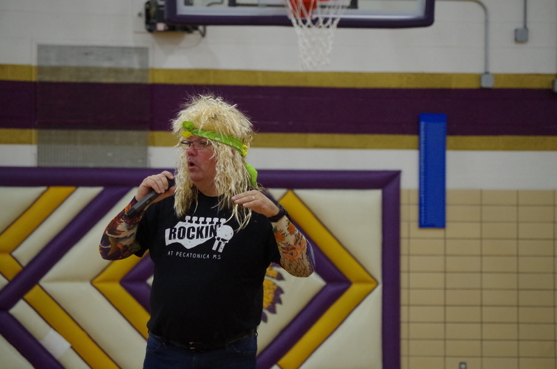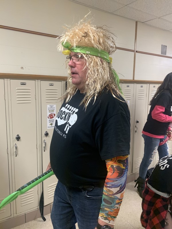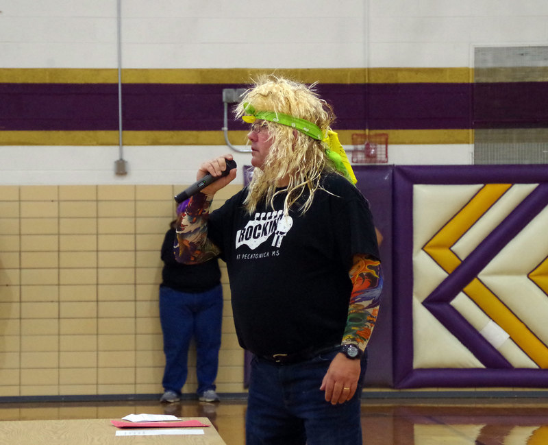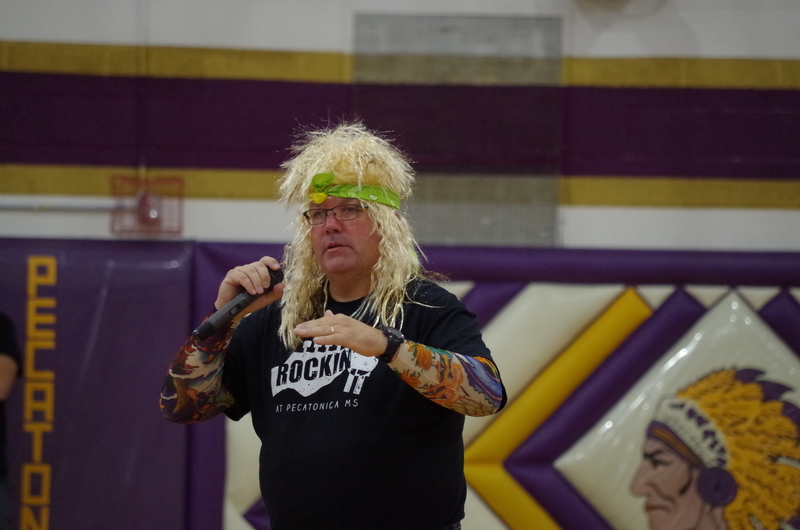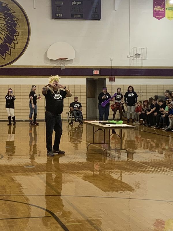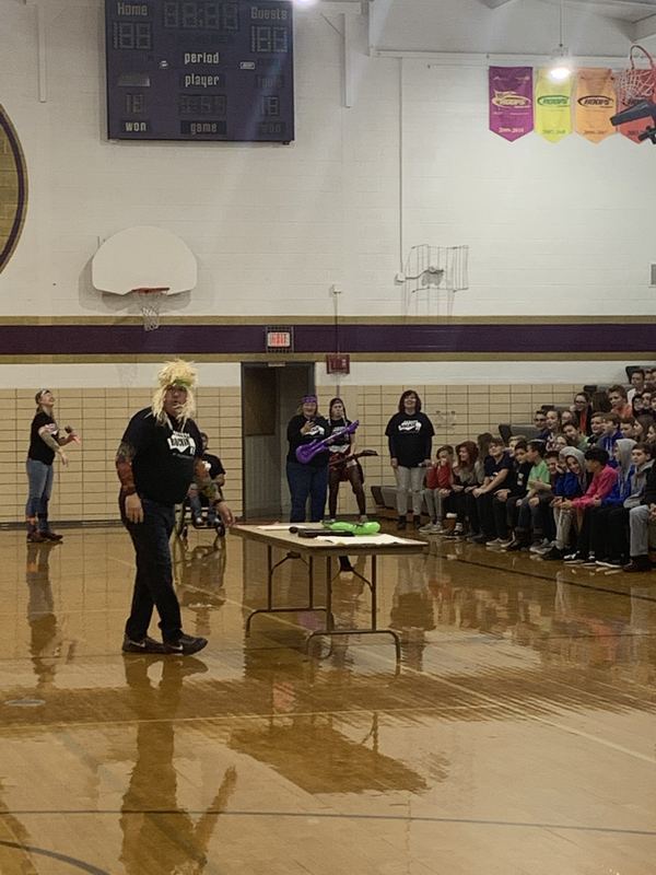 Rockstar Principal Tim King celebrates Superior Honor Roll Students by Rockin' Out at the 1st Quarter Awards Assembly. Staff dressed up as rock stars for the assembly and Principal Tim King jumped off stage and the student body went wild as he played his air guitar. Then Principal King high-fived the 10 Superior Honor Roll Students as they made their way across the stage!