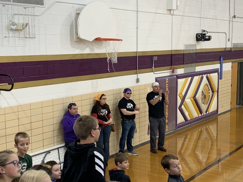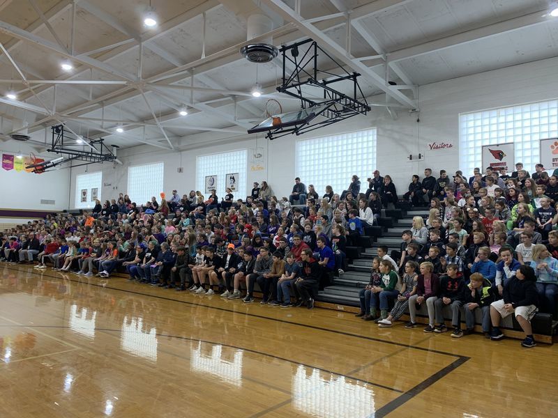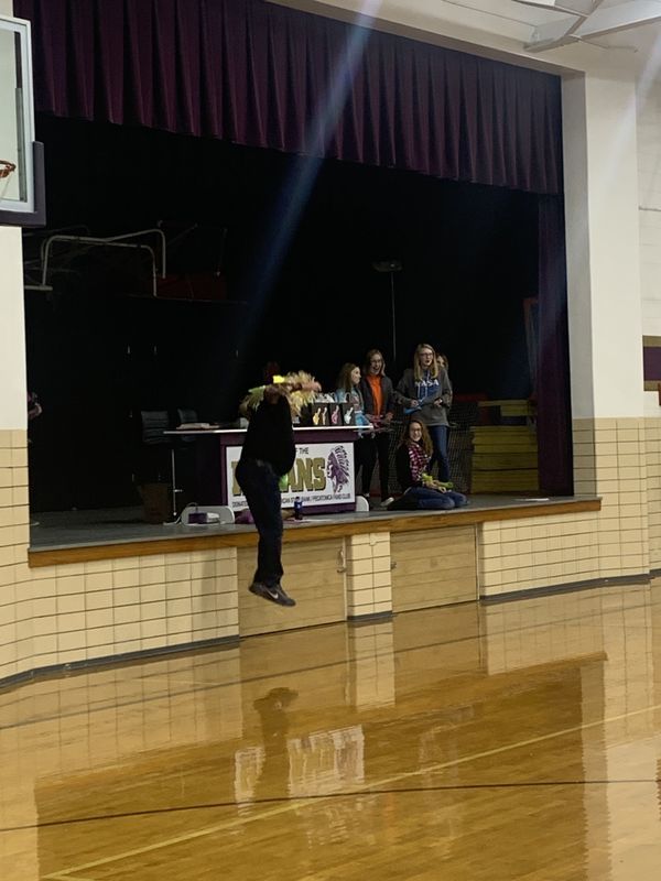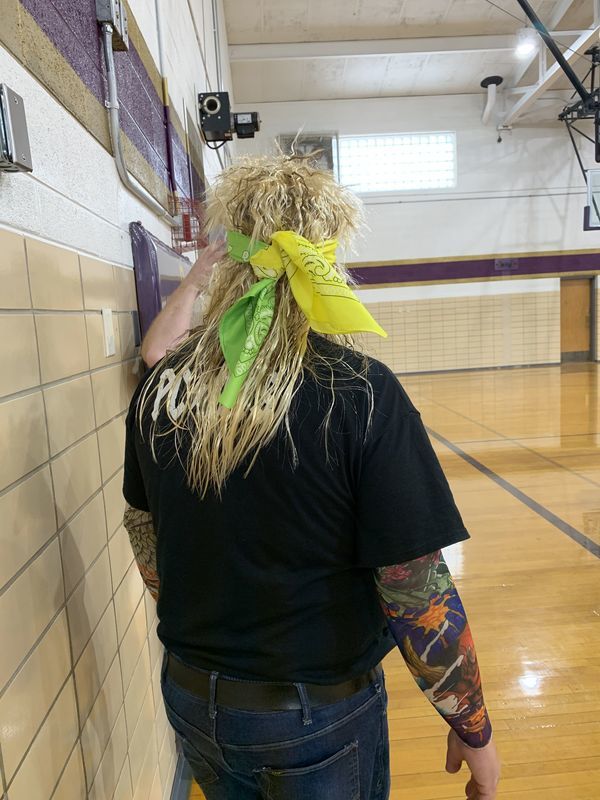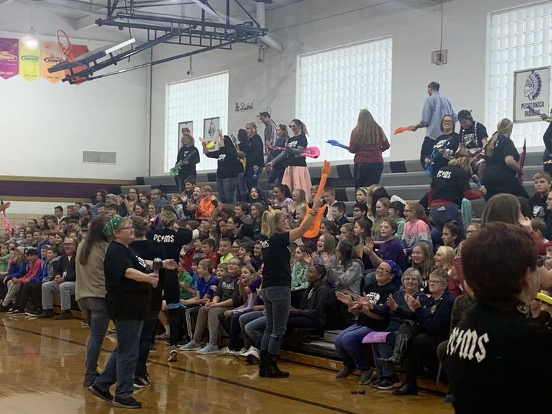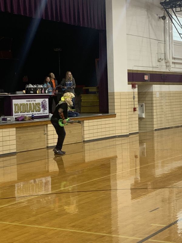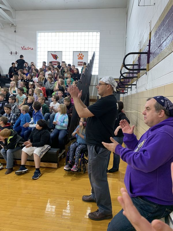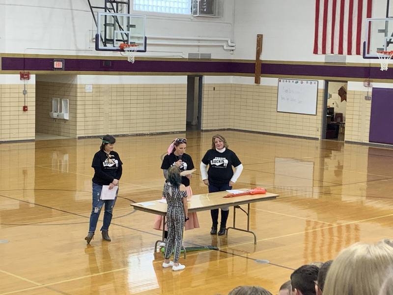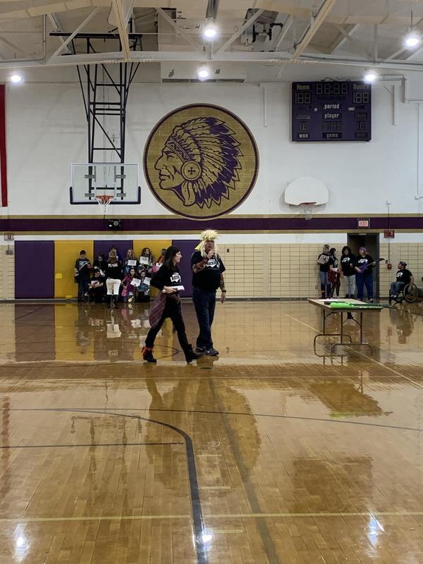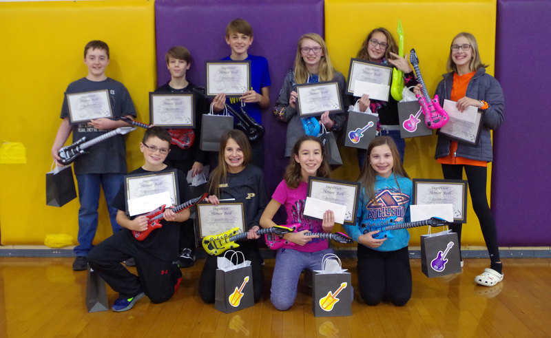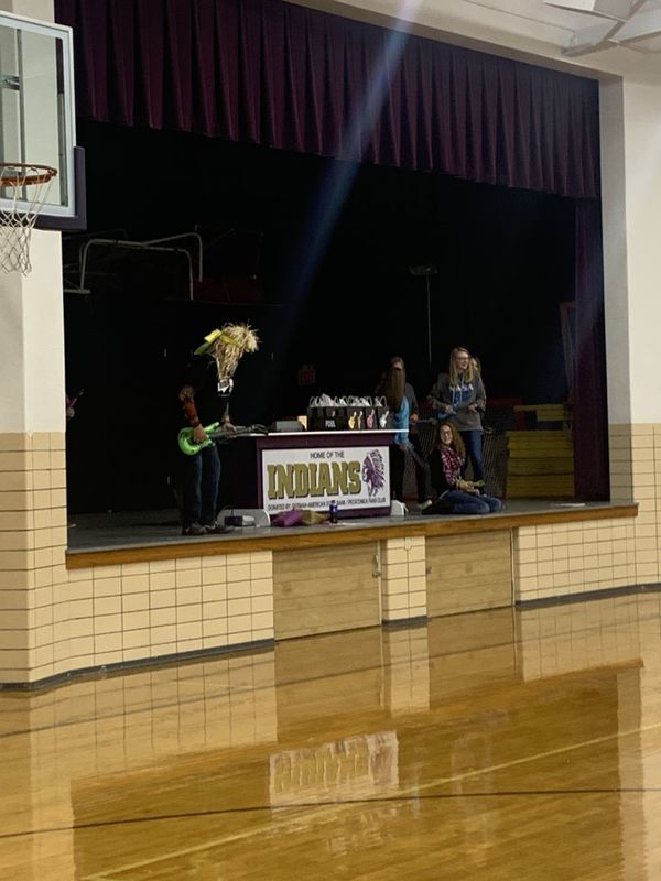 Rockstar Principal Tim King celebrates Superior Honor Roll Students by Rockin' Out at the 1st Quarter Awards Assembly. Staff dressed up as rock stars for the assembly and Principal Tim King jumped off stage and the student body went wild as he played his air guitar. Then Principal King high-fived the 10 Superior Honor Roll Students as they made their way across the stage!