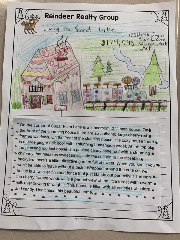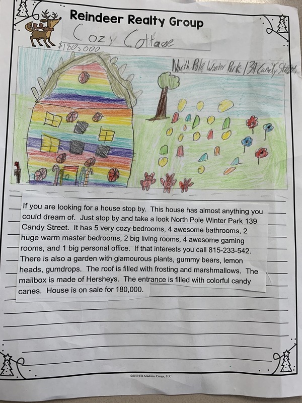 Mrs. Fowler's Reading and English classes did a gingerbread house project that started with writing a flyer about their house for sale. The students had to use positive detailed words in their ad to make their house sound the best! The houses range in price from $85,000 to well over a million dollars!