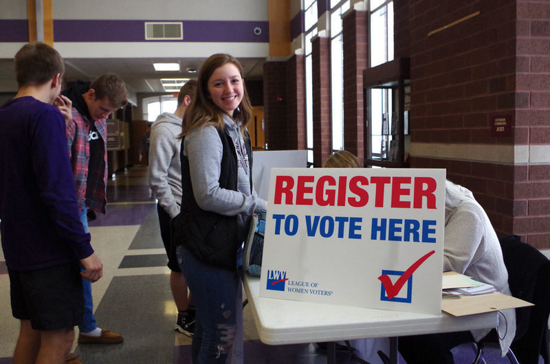 Eligible students lined up in the high school commons last week to get registered to vote. The law permits 17-year-old students to participate in Illinois primary elections as long as they will be 18 by the November General Election.