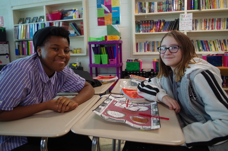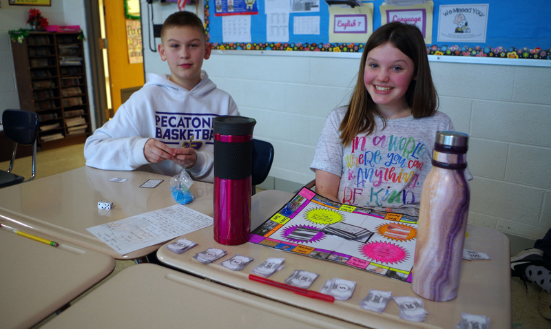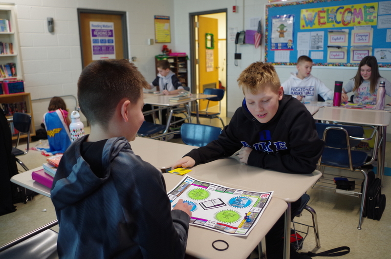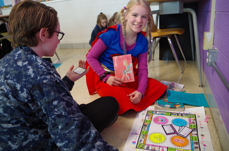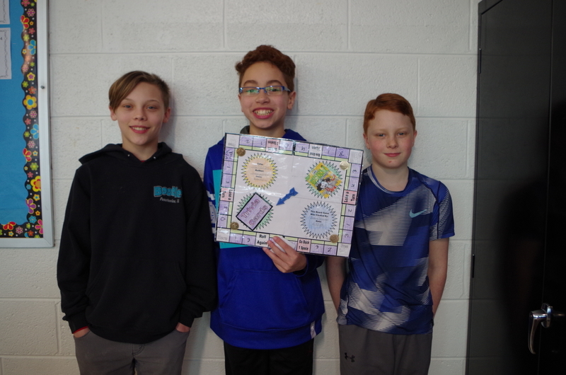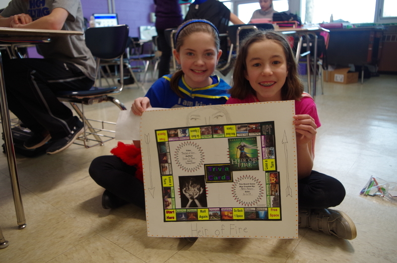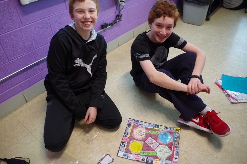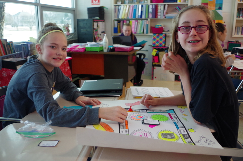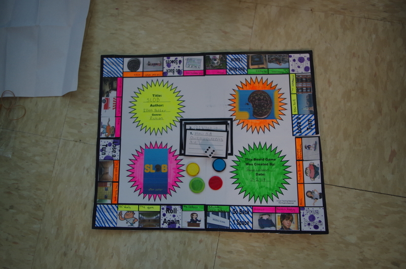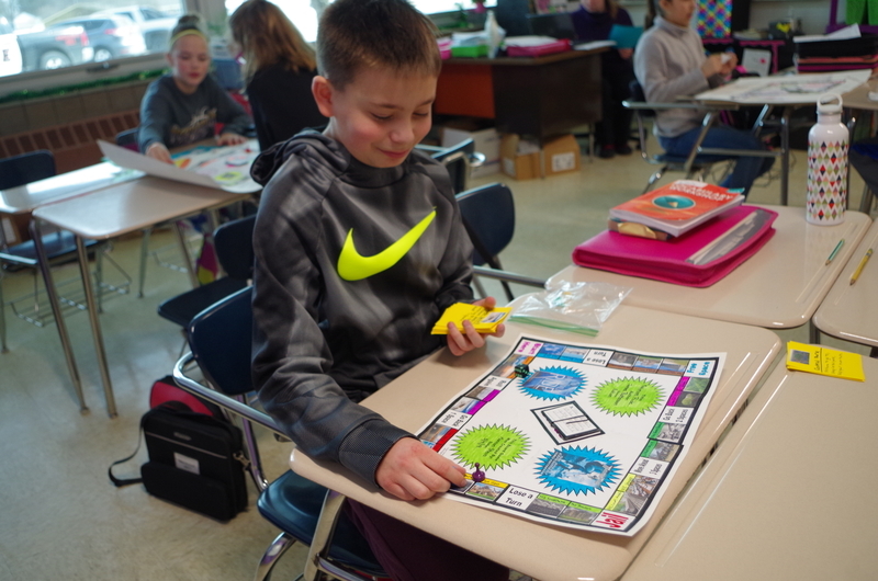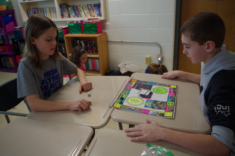 Ms. Lutzow’s 6th grade students have been busy, reading, creating and playing a self made book report game. Students read a book and then were given a game board to design a themed book report game board that included book components such as characters and themes. Question cards were designed with the contents of the book and also an outline for opponents to study. Let the games begin!